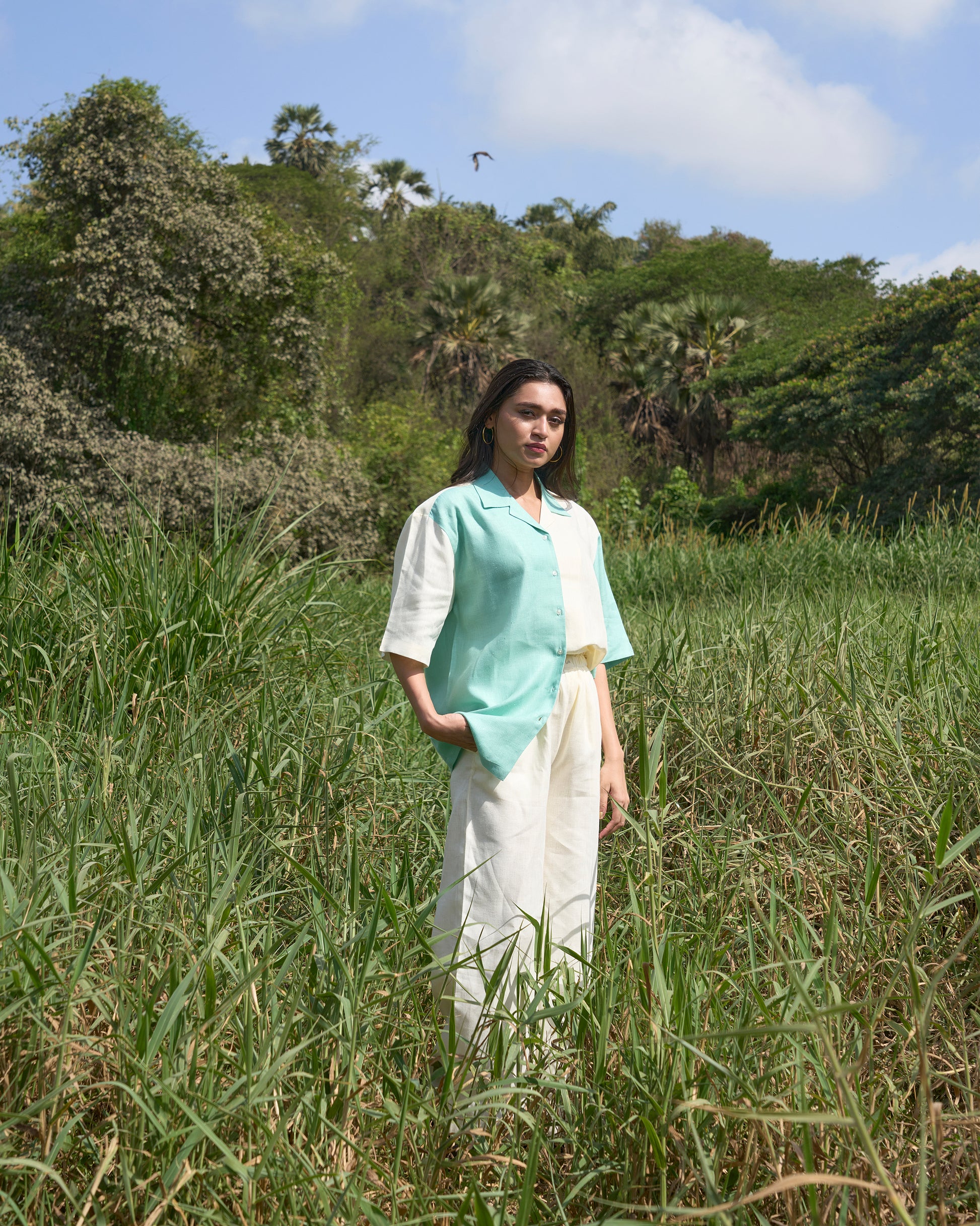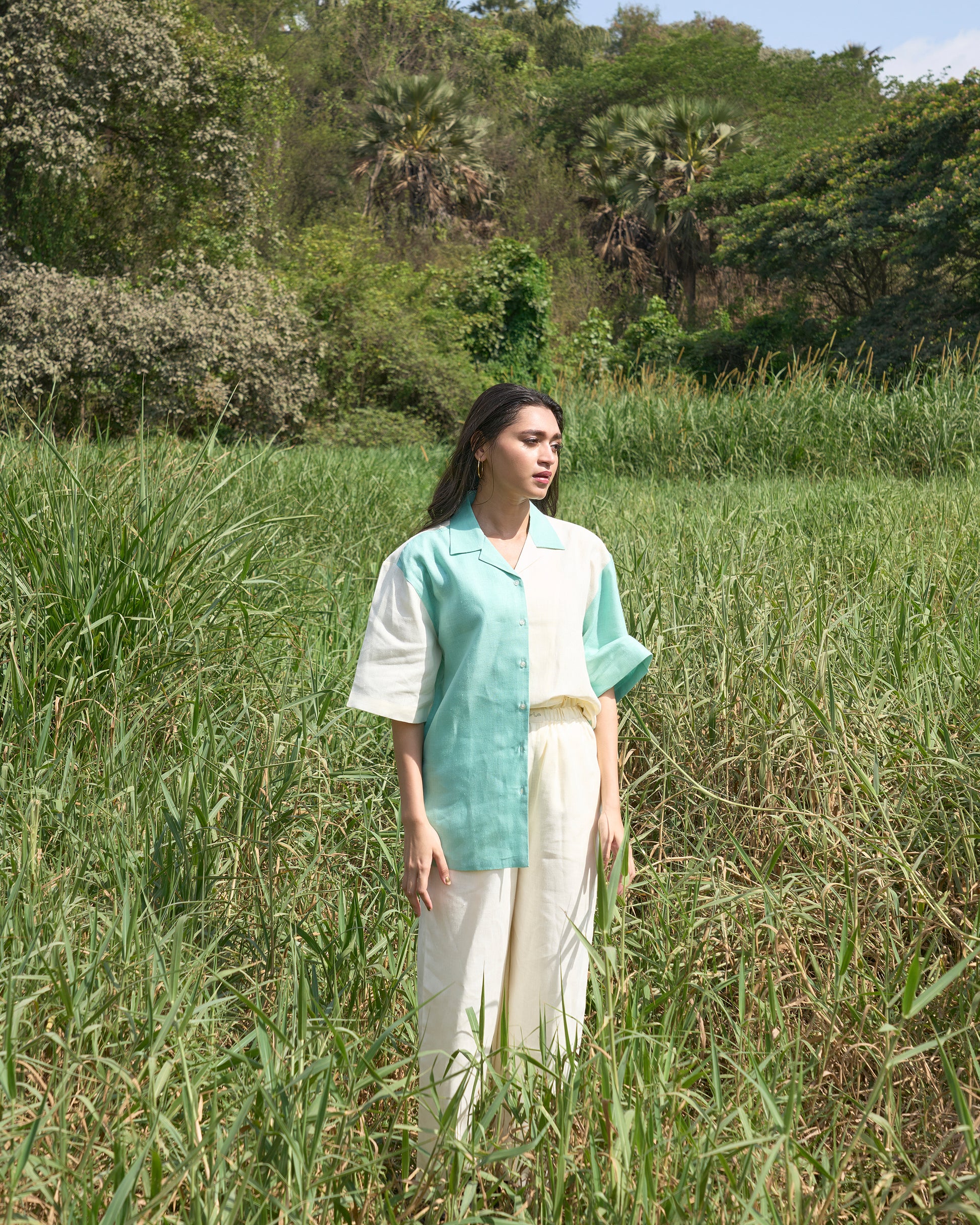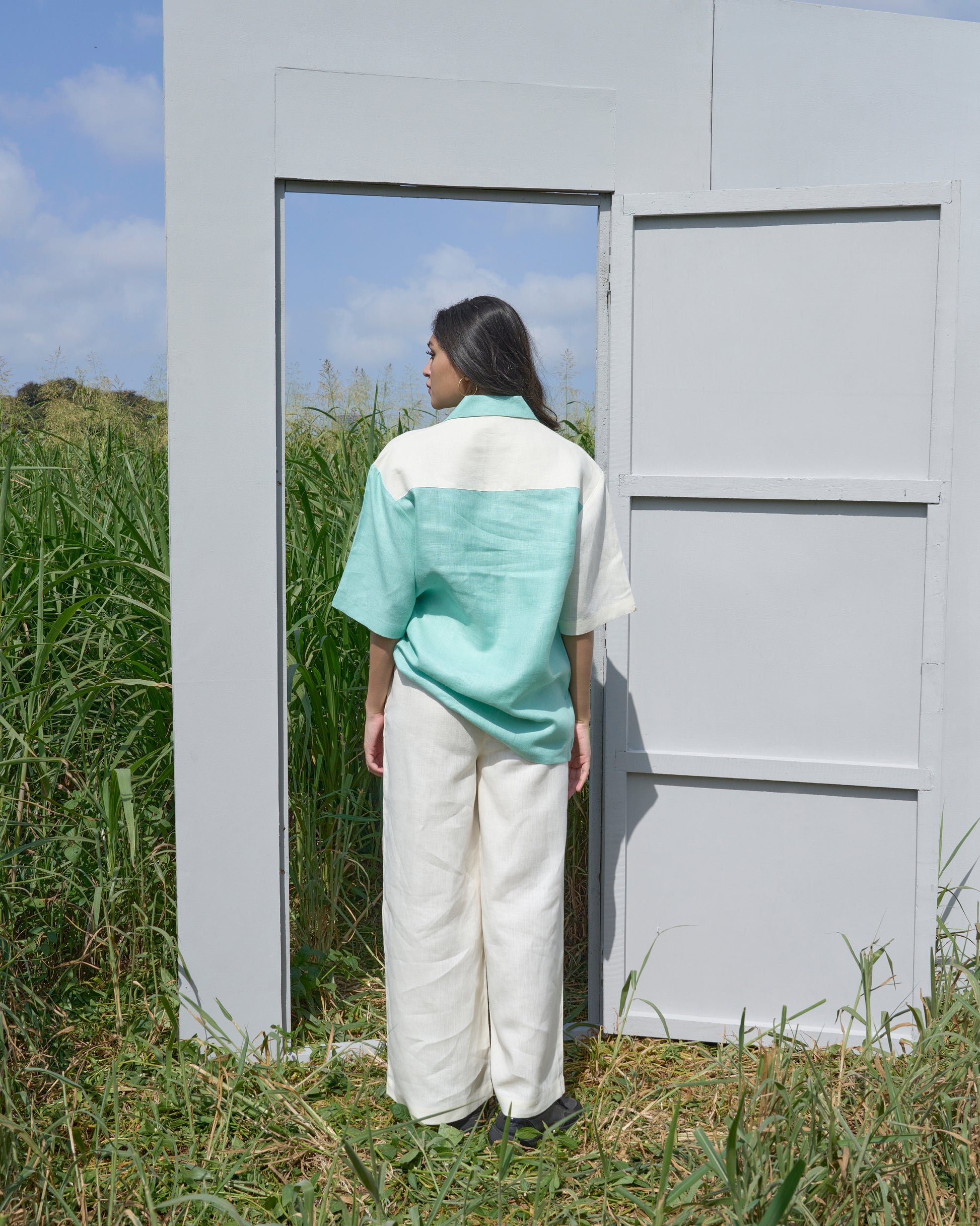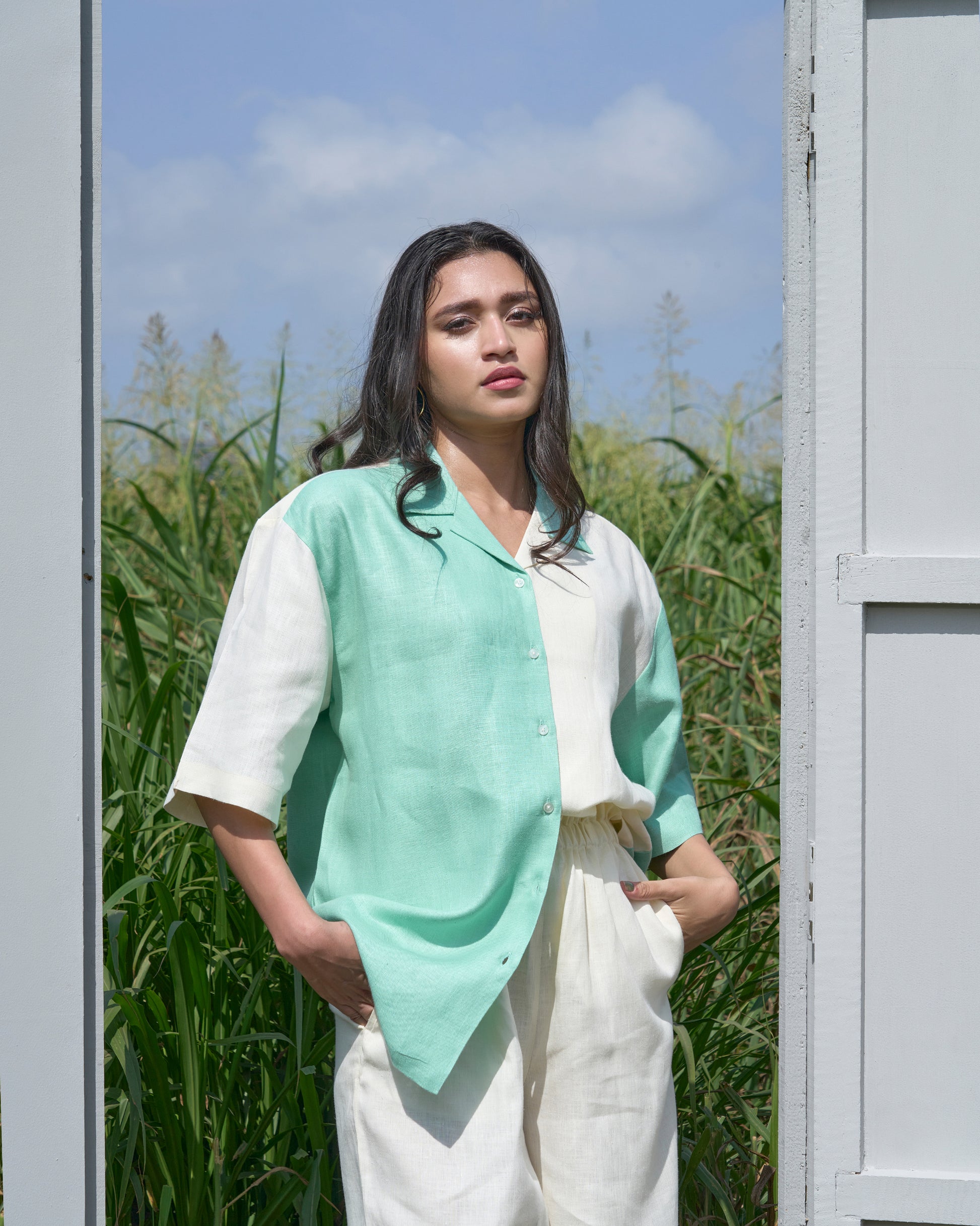 The Duo Tone Shirt boasts a unique design with a combination of Buttercream and Sea Foam hues, creating a striking visual appeal. The shirt features a relaxed fit, short sleeves, and a classic collar, making it versatile for various occasions. The lightweight and breathable hemp fabric ensures you stay cool and comfortable throughout the day, perfect for warm weather.