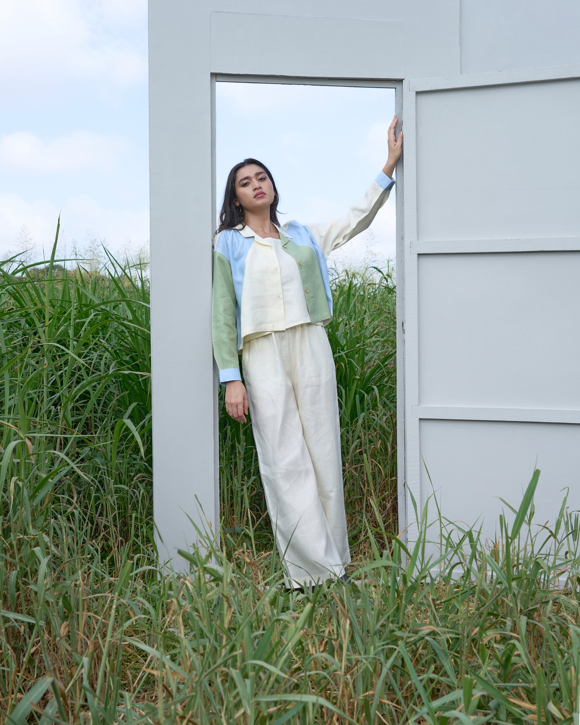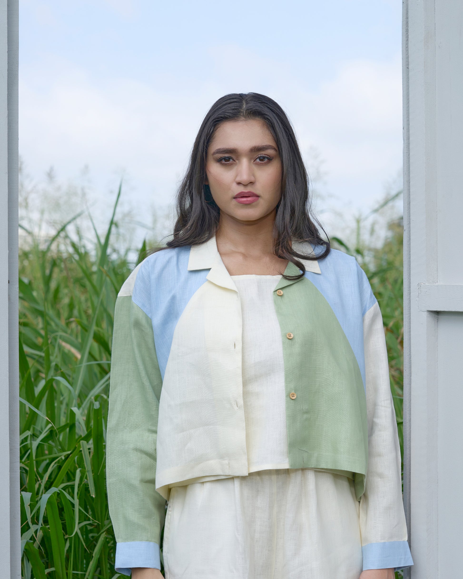 The Pastel Hues Jacket stands out with its unique colorblock design, combining soft, soothing shades of Buttercream, Blueberry, and Pistachio. This chic, tailored jacket offers a modern twist with its sleek silhouette and distinctive wooden buttons, adding a touch of natural sophistication. The relaxed fit and light, breathable hemp fabric ensure comfort and style, making it perfect for any occasion.
