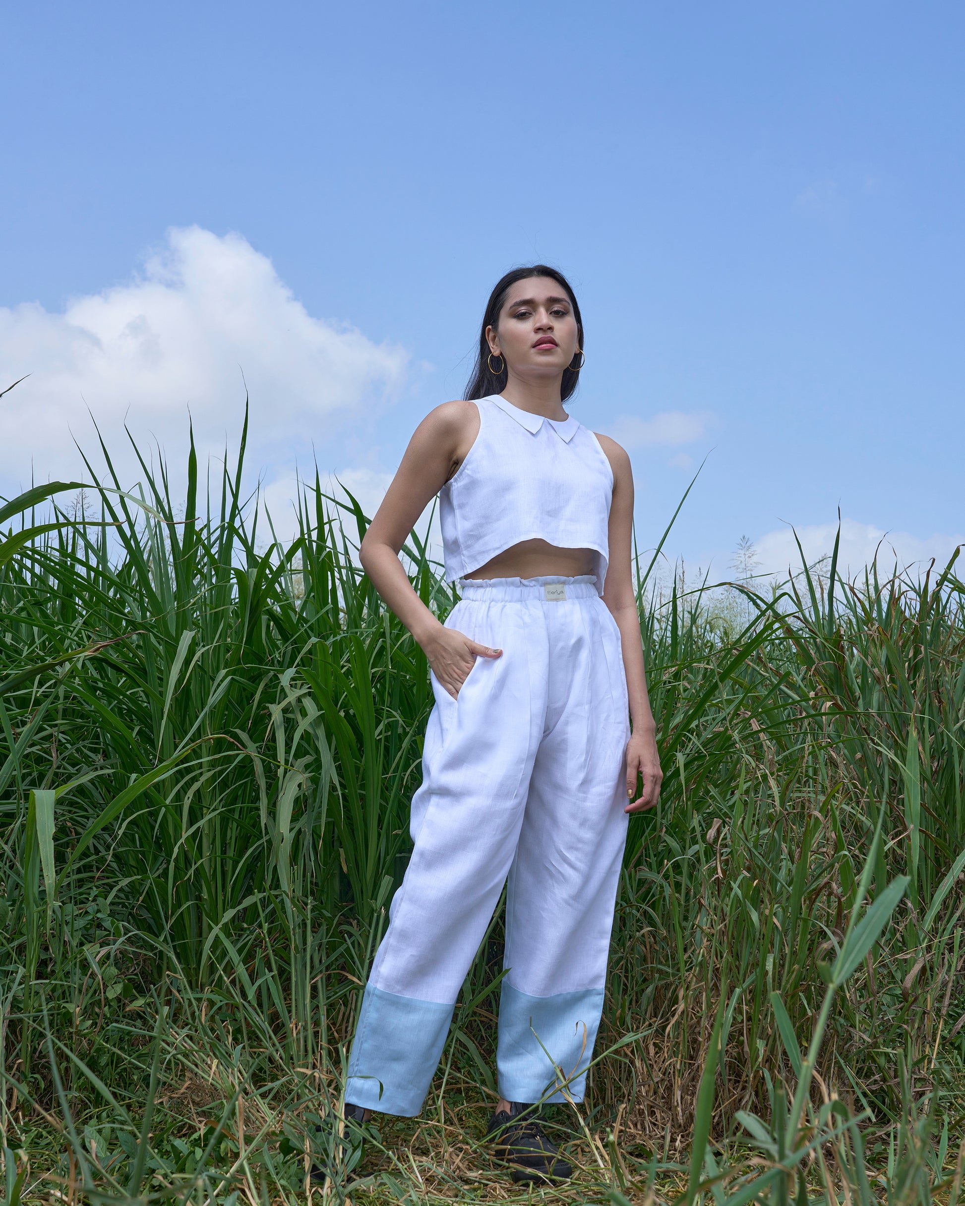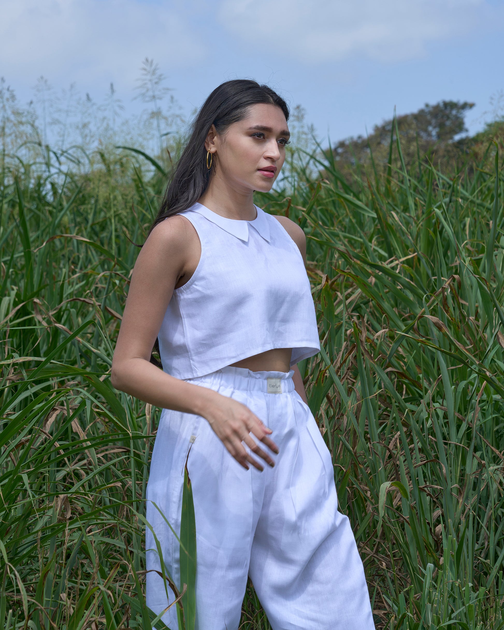 Paired with the pants, the Snow White Petal Top features a sleek, sleeveless design with a chic, cropped cut and a classic collar. Its clean lines and modern silhouette make it a versatile piece that complements the Edge Pants perfectly. The breathable hemp fabric ensures maximum comfort, making it perfect for warm weather.